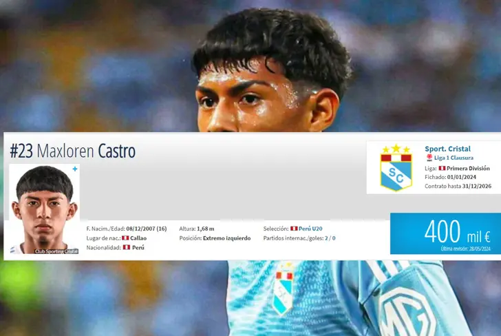 Según el portal especializado 'Transfermarkt', podemos apreciar que Maxloren Castro tiene una cotización internacional de 400 mil euros, lo que al cambio de la moneda peruana daría un promedio cercano a los 1,6 millones. Si con 16 años de edad tiene este precio a nivel mundial, de seguir creciendo y mostrándose como una verdadera joya en el país, podría incluso pensar en incrementar su valor para romperla de manera mucho más top.