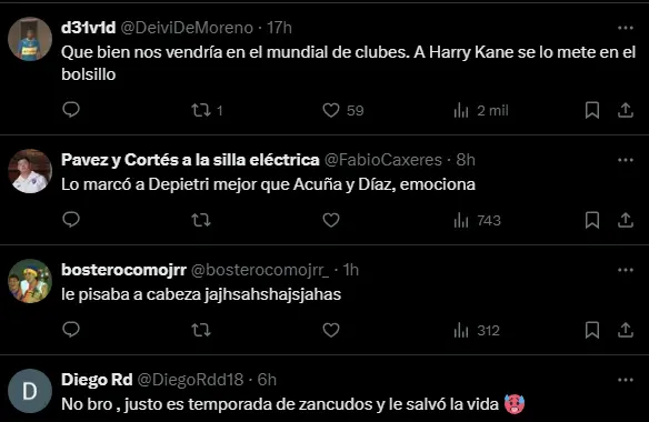Lejos de condenarlo, muchos hinchas de Boca salieron a defenderlo e incluso a extrañarlo. Comentarios como “Te extraño, Kaiser”, “Lo marcó mejor que Acuña” o “A Harry Kane se lo mete en el bolsillo” inundaron X (antes Twitter). Incluso hubo quienes recordaron su salida con bronca: “Y pensar que se fue para que se quede el Pipa, lo hace más doloroso”.