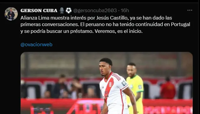 “Alianza Lima muestra interés por Jesús Castillo. Ya se han dado las primeras conversaciones. El peruano no ha tenido continuidad en Portugal y se podría buscar un préstamo. Veremos, es el inicio”; informó de manera detallada el comunicador deportivo Gerson Cuba a través de su cuenta de twitter, aunque entendemos que por un tema de sentimiento e identificación total con los colores celestes esta negociación no podría llegar a un buen puerto ya que de ser así se comería un tremendo problema con los aficionados al haberse formado en el club y ser uno de los canteranos que mejor supo representar los colores y los valores de la institución de una manera bastante impecable y con la que siempre fue un ejemplo para los jóvenes del club rimense.