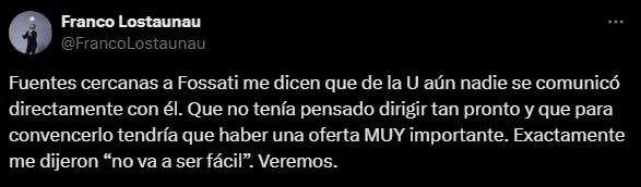 "Fuentes cercanas a Fossati me dicen que de la ‘U’ aún nadie se comunicó directamente con él. Que no tenía pensado dirigir tan pronto y que para convencerlo tendría que haber una oferta muy importante", escribió Lostaunau en X.