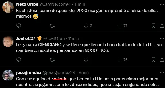 Con este comentario del expresidente del Fondo Blanquiazul, Juan Diego Gonzales Posada, la respuesta del hincha de Universitario de Deportes no se hizo esperar. Por lo tanto, varios comentaron sobre esta situación, burlándose bastante del equipo de Alianza Lima, al cual en estos momentos no lo consideran como un verdadero rival, pero podrían llegar a verse las caras en una final nacional.