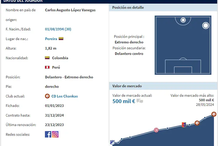 Según la web internacional 'Transfermarkt', podemos apreciar que Carlos López tiene un precio monetario de 500 mil euros, lo que en soles daría un aproximado cercano a los 2 millones. También es interesante recalcar que el atacante colombiano de Los Chankas de Andahuaylas es un habitual titular en el plantel, así que desde ya representa ser uno de los jales más importantes en equipos de provincia y quién dice que en un futuro cercano pueda llegar a Alianza Lima si es que las negociaciones se concretan.