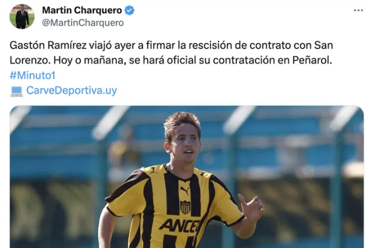 “Gastón Ramírez viajó ayer a firmar la rescisión de contrato con San Lorenzo. Hoy o mañana, se hará oficial su contratación en Peñarol"; fue la más reciente y contundente información que soltó el reconocido comunicador deportivo Martín Charquero en relación a que el volante creativo ya tiene asegurado su futuro más cercano y por más que haya existido sondeos de la ´U´, estos finalmente quedaron en nada y ahora deberán seguir evaluando más opciones.