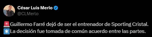 "Guillermo Farré dejó de ser el entrenador de Sporting Cristal. La decisión fue tomada de común acuerdo entre las partes", fue lo que pudo dar a conocer el periodista en sus redes sociales.