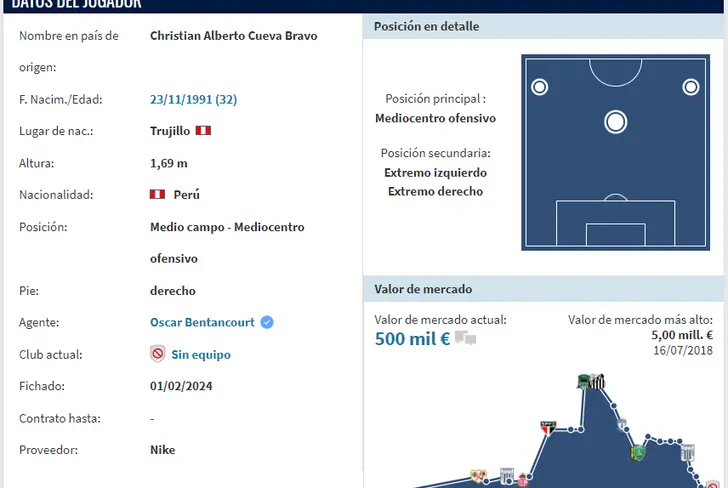 Christian Cueva tiene un precio internacional de 500 mil euros, lo que en soles daría un promedio cercano a los 2 millones, según la web especializada ‘Transfermarkt’. En su mejor momento, cuando jugaba en el Santos FC de Brasil, el popular ‘Aladino’ costaba 5 millones de euros allá por el año 2019, es decir unos 20 millones de soles al cambio de la moneda peruana. Es imposible que ahora, o en futuro cercano, vuelva a contar con dicho valor en su ficha mundial, pero dependerá de él que pueda al menos reaparecer en un campo de juego.