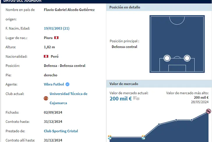 Flavio Alcedo, zaguero central peruano de 21 años, tiene un precio internacional de 200 mil euros, lo que en soles daría un promedio cercano a los 800 mil, según la web especializada ‘Transfermarkt’. Al ser un canterano de Sporting Cristal, es muy probable que en un futuro cercano pueda tener chances de jugar en el club que lo vio nacer deportivamente, tal y como ha sido con varios jugadores que hoy en día la rompen en el primer equipo y que poco a poco se fueron ganando un nombre en los medios locales y sobre todo en los hinchas rimenses.