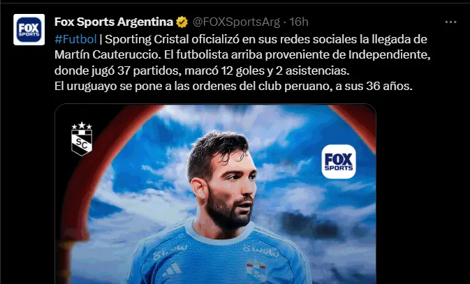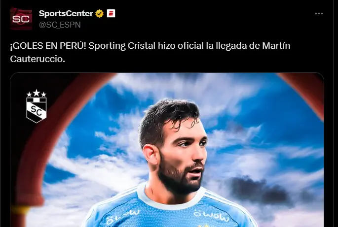 “Sporting Cristal oficializó en sus redes sociales la llegada de Martín Cauteruccio. El futbolista arriba proveniente de Independiente, donde jugó 37 partidos, marcó 12 goles y 2 asistencias. El uruguayo se pone a las órdenes del club peruano, a sus 36 años”; informó ´Fox Sports Argentina´ y “¡GOLES EN PERÚ! Sporting Cristal hizo oficial la llegada de Martín Cauteruccio”; comentó ´SportsCenter´ en sus plataformas digitales. De esta manera es que los medios deportivos argentinos no han sido ajenos al ver que un jugador muy reconocido de su liga concretó finalmente su arribo a La Florida.