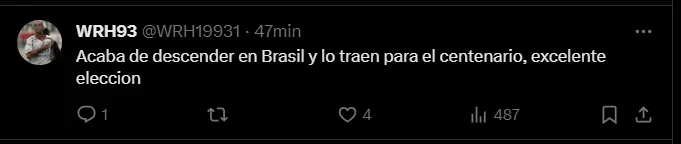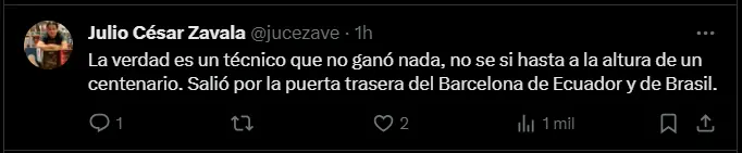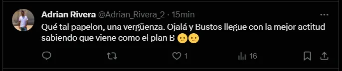 “Qué tal papelón, una vergüenza. Ojalá y Bustos llegue con la mejor actitud sabiendo que viene como el plan B”, “Nos vendieron el cuento que tenían todo preparado desde hace meses, que se venía trabajando para el centenario”, “Acaba de descender en Brasil y lo traen para el centenario, excelente elección”, “Muy buena noticia!! Técnico de otro perfil!! Seguimos con la escuela rioplatense!!”, “La verdad es un técnico que no ganó nada, no sé si hasta a la altura de un centenario. Salió por la puerta trasera del Barcelona de Ecuador y de Brasil”; son algunos de los comentarios más resonantes a través de twitter. Apuesta en Betsson a los partidos de las mejores ligas del mundo y recibe un bono de bienvenida de 50 soles