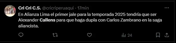 “En Alianza Lima el primer jale para la temporada 2025 tendría que ser Alexander Callens para que haga dupla con Carlos Zambrano en la zaga aliancista”; es uno de los comentarios y pedidos más llamativos que se pueden apreciar a través de las redes sociales tras ver cómo ambos defensores centrales se complementaron de la mejor manera el día de ayer en el Estadio Monumental de Ate en el encuentro amistoso frente a Paraguay, lo cual podría generar una alerta en la directiva victoriana.
