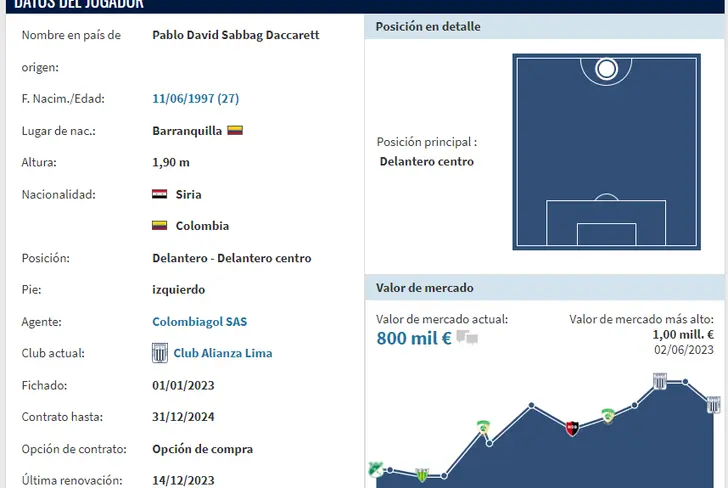 Pablo Sabbag tiene un precio internacional de 800 mil euros, lo que en soles daría un promedio cercano a los 3,2 millones, según el portal especializado 'Transfermarkt'. Su mejor valor en el mercado fue de 1 millón de euros durante la temporada 2023 cuando también vestía la camiseta de Alianza Lima y era uno de los valores más importantes del plantel, una situación en la que deberá trabajar en el presente para volver a ganarse el cariño y el respeto del hincha victoriano.