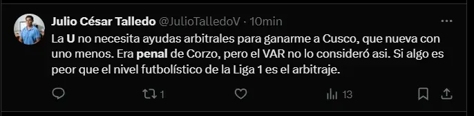 Y es que los comentarios indican que efectivamente Universitario de Deportes no necesita de este clase de ayudas para que ganar un partido del Torneo Apertura ni mucho menos para seguir prendidos en la parte más alta del de la tabla de posiciones, sobre todo cuando no es la primera vez que una acción ofensiva del cuadro rival no es revisada determinante por el video arbitraje y existe la sensación de que no miden con la misma vara a los equipos cremas que a los demás.