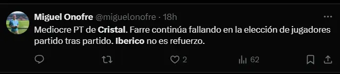 El propio hincha de Sporting Cristal también se ha dado cuenta de esta situación y, tras la dura derrota de ayer ante FBC Melgar en el Estadio de la UNSA de Arequipa, ha reaccionado de manera no tan buena ante la presentación de Luis Iberico en el campo de juego. Siendo este su tercer partido como titular y aparentemente contando con la confianza del comando técnico liderado por el profesor Guillermo Farré, la verdad es que no ha sido capaz de retribuir dicho respaldo y se le nota bastante lejos de las buenas actuaciones que mostró en su mejor momento.