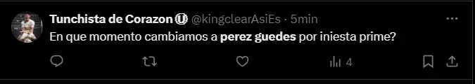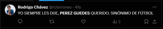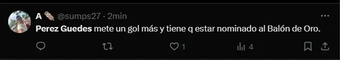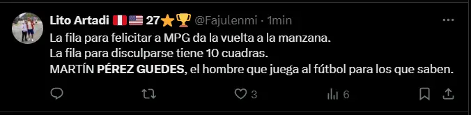 “YO SIEMPRE LES DIJE, PÉREZ GUEDES QUERIDO. SINÓNIMO DE FÚTBOL”, “La fila para felicitar a MPG da la vuelta a la manzana. La fila para disculparse tiene 10 cuadras. MARTÍN PÉREZ GUEDES, el hombre que juega al fútbol para los que saben”, “Perez Guedes mete un gol más y tiene que estar nominado al Balón de Oro”, y “¿En qué momento cambiamos a Pérez Guedes por Iniesta prime?; son algunas de las reacciones y comentarios más llamativos por parte de los aficionados de la ´U´ al ver que el equipo de sus amores viene destrozando a un Comerciantes Unidos sin reacción alguna.