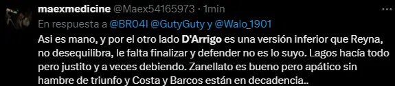 Uno de los que todos pedían en el 11 titular era Jhamir D'Arrigo, pues claro, lo querían por encima de Ricardo Lagos, sin imaginar lo que les daba 'Richi' era mucho mejor, pues el exMelgar ante Sporting Cristal fue una lágrima, desaprovechó oportunidades, centros malos y no pudo generar ocasiones por su lado izquierdo del campo en Alianza Lima. Apuesta en Betsson a los partidos de las mejores ligas del mundo y recibe un bono de bienvenida de 50 soles