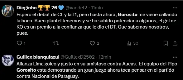 Los comentarios positivos hacia Gorosito se han incrementado en las últimas semanas, a medida que el equipo ha ido mostrando una mejoría en su juego. La victoria ante Aucas y el empate ante LDU en Ecuador son una muestra de que Alianza Lima está en buen camino y que Gorosito está haciendo un buen trabajo.