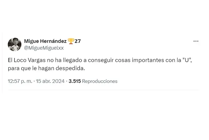 A pesar de que hace poco, Jefferson Farfán solicitó al administrador de la 'U' organizarle el partido de despedida al ex Fiorentina, los hinchas cremas en 'X' se opusieron tajantemente. "No creo… puede tener su despedida como crack que fue, pero de ahí a que se lo haga la U???", "El Loco Vargas no ha llegado a conseguir cosas importantes con la "U", para que le hagan despedida", "Se lo quiere mucho al Loco, pero no. Antes hubiera preferido uno a Ibáñez", "Cuantos títulos nos dio el loco, listo", "La verdad es que el loco no marco mucha historia en universitario, tal vez un partido con otra jugadores, como Balbín, Vasquez, Guastavino y hasta tal vez Quinteros", fueron algunos comentarios de los seguidores de la 'U' en dicha red social.