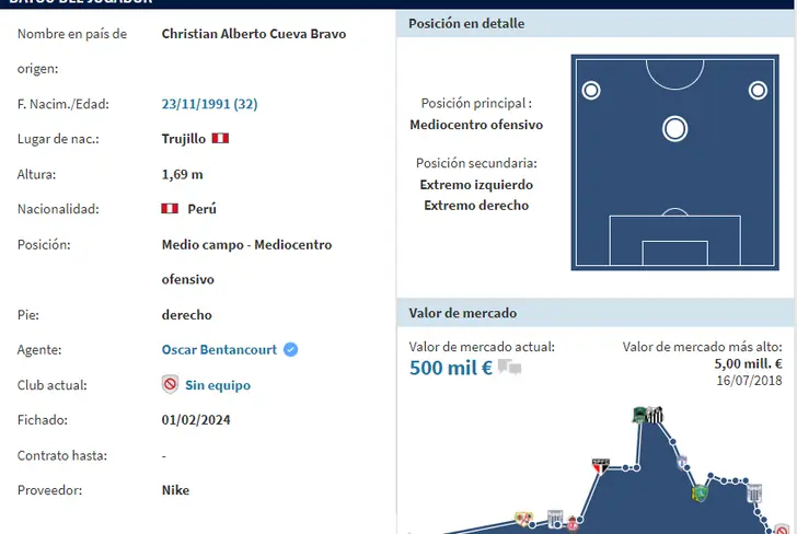 Tras el flamante refuerzo del Cienciano del Cusco, Christian Cueva tiene una cotización internacional de 500 mil euros, lo que en soles daría un promedio cercano a los 2 millones, de acuerdo al portal especializado 'Transfermarkt'. Veremos si finalmente en esta nueva etapa de su trayectoria logra recomponerse y demostrar que todavía puede brillar en un campo de juego, sino será lo mismo de siempre y 'Chollywood' lo espera con los brazos abiertos.