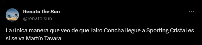 “La única manera que veo de que Jairo Concha llegue a Sporting Cristal es si se va Martín Távara”; fue la concisa y a la vez reveladora información que soltó el periodista deportivo Renato The Sun dando una clara muestra de que una futura venta del canterano bajopontino sería la única condición para que la directiva liderado por Joel Raffo haga el esfuerzo de contar con los servicios de un Jairo que ahora se encuentra entrenando por su cuenta a la espera de una verdadera oferta tentadora que lo anime a tomar un nuevo reto.