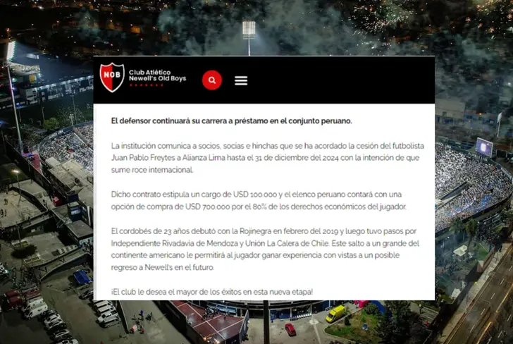 “Mediante un comunicado, Newell's Old Boys indicó que Juan Pablo Freytes será jugador de Alianza Lima hasta el 31 de diciembre del 2024 con la internación de que sume roce internacional. Luego, explicaron que el contrato estipulaba un cargo de USD 100.000. Además, indicaron que Alianza Lima contará con una opción de compra de USD 700.000 por el 80% de los derechos económicos del jugador. El conjunto blanquiazul deberá analizar si harán uso de la cláusula de preferencia”; informó de manera detallada el diario local ´Líbero´ en relación a lo que en su momento recalcó la institución argentina.