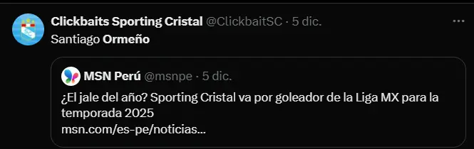El mercado de fichajes en el fútbol peruano continúa siendo movido y uno de los rumores más fuertes apunta a la llegada de Santiago Ormeño a Sporting Cristal. El delantero peruano-mexicano, que ha tenido un paso irregular por el fútbol mexicano, sería la principal opción para reforzar el ataque celeste y competir directamente con Martín Cauteruccio por un puesto en el once titular.