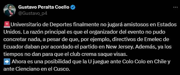 "Universitario de Deportes finalmente no jugará amistosos en Estados Unidos. La razón principal es que el organizador del evento no pudo concretar nada, a pesar de que, por ejemplo, directivos de Emelec de Ecuador daban por acordado el partido en New Jersey. Además, ya los tiempos no dan para que el club crema saque visas. Ahora es una posibilidad que la U juegue ante Colo Colo en Chile y ante Cienciano en el Cusco", pudo dar a conocer el periodista deportivo Gustavo Peralta.