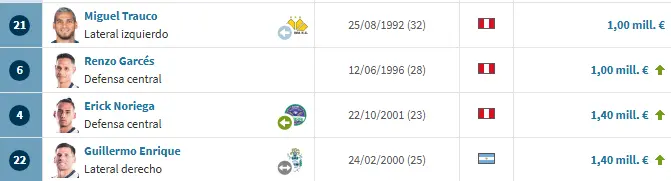 Nos encontramos con 4 futbolistas que pasan el millón. Guillermo Enrique y Erick Noriega comparten el primer lugar con 1,4 millones. Mientras Renzo Garcés y Miguel Trauco los siguen con 1 millón.