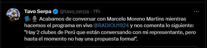 “Acabamos de conversar con Marcelo Moreno Martins mientras hacemos el programa en vivo ´RADIOU1924´ y nos comenta lo siguiente: ´Hay 2 clubes de Perú que están conversando con mi representante, pero hasta el momento no hay una propuesta formal´; informó a través de cuenta de twitter el periodista deportivo Tavo Serpa en señal de que sí ha existido un acercamiento con el goleador histórico de la Selección Boliviana y uno de los que tomaría postura al respecto tranquilamente sería Sporting Cristal. Apuesta en Betsson a los partidos de las mejores ligas del mundo y recibe un bono de bienvenida de 50 soles