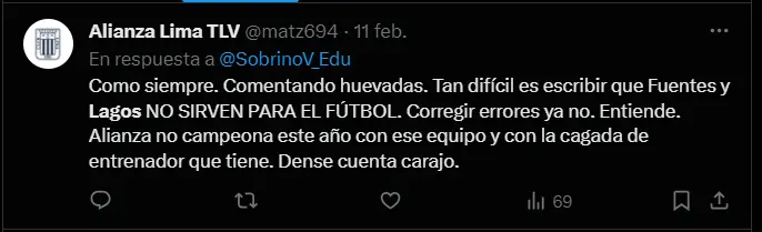 “Como siempre. Comentando huevad... Tan difícil es escribir que Fuentes y Lagos NO SIRVEN PARA EL FÚTBOL. Corregir errores ya no. Entiende. Alianza no campeona este año con ese equipo y con la cagad... de entrenador que tiene. Dense cuenta caraj..”; es uno de los comentarios más resonantes que se pueden apreciar en las redes sociales respecto a los jugadores victorianos anteriormente expuestos en dicho sentido.