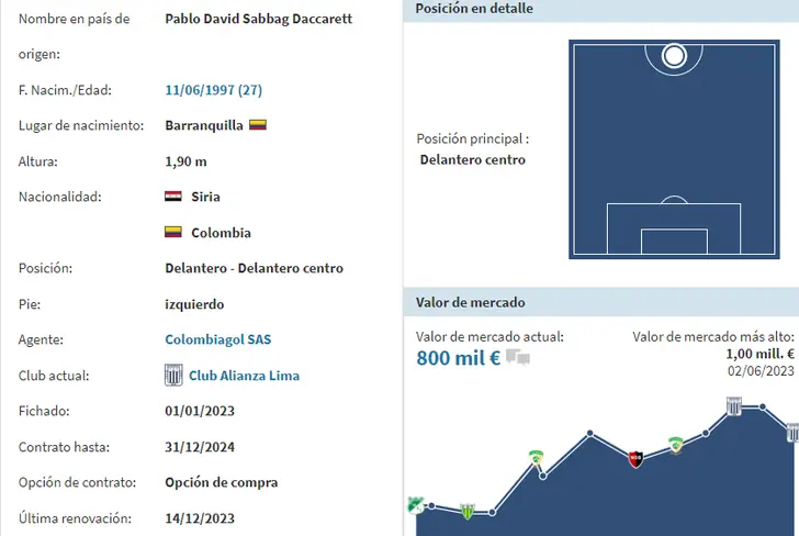 El atacante colombiano con raíces sirias de 27 años tiene una cotización internacional de 800 mil euros, lo que en soles daría un promedio cercano a los 3,2 millones, de acuerdo al portal especializado ‘Transfermarkt’. Es así que la presencia de Pablo Sabbag representa ser uno de los refuerzos más importantes de Alianza Lima para lo que se viene en el Torneo Clausura, por lo que desde ya el comando técnico podría darle un salto de calidad al vestuario desde la fecha 1.