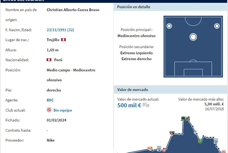 De acuerdo al portal especializado 'Transfermarkt', podemos apreciar que Christia Cueva tiene un precio monetario de 500 mil euros, lo que en soles daría un promedio cercano a los 2 millones. Veremos si es que el volante nacional es capaz de recuperar algunos pasajes de los buenos rendimientos que supo mostrar en su momento, aunque para hacerlo en la altura de la ciudad del Cusco deberá estar al 100% en lo físico y no tener ni un gramo de grasa.