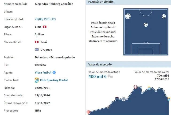 Alejandro Hohberg tiene un precio internacional de 400 mil euros, lo que en soles equivaldría aproximadamente a 1,6 millones, según el portal especializado 'Transfermarkt'. Cabe destacar que solo queda una semana para que el mercado de pases actual llegue a su fin. Si el atacante realmente desea ser cedido a préstamo, considerando que su contrato con Sporting Cristal termina a fin de año, deberá actuar con celeridad. De lo contrario, podría buscar la resolución del contrato para ser libre de elegir su próximo destino.