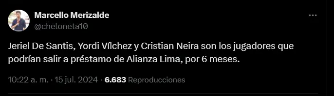 “Jeriel De Santis, Yordi Vílchez y Cristian Neira son los jugadores que podrían salir a préstamo de Alianza Lima, por 6 meses”; fue la más reciente información que ha compartido el reconocido comunicador deportivo Marcello Merizalde a través de su cuenta de twitter en cuanto a las novedades que presentaría el cuadro blanquiazul, a la espera de que en las próximas horas se pueda oficializar esta decisión y a la vez a conocer a qué clubes se irían los nombres mencionados.
