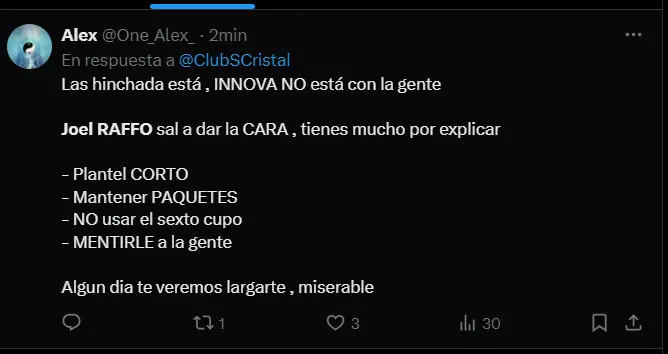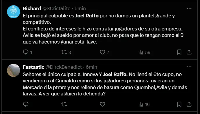 ¿Se imaginan de quién estamos hablando? Claro que sí, nos referimos explícitamente a Joel Raffo, presidente de la institución quien junto al área deportiva no supieron armar un plantel verdaderamente competitivo y que pueda dar la talla a nivel continental pensando seguramente que con lo hecho el año pasado iba a alcanzar, pero ya se dieron cuenta que con los jugadores actuales no fue suficiente para meterse a fase de grupos. Apuesta en Betsson a los partidos de las mejores ligas del mundo y recibe un bono de bienvenida de 50 soles