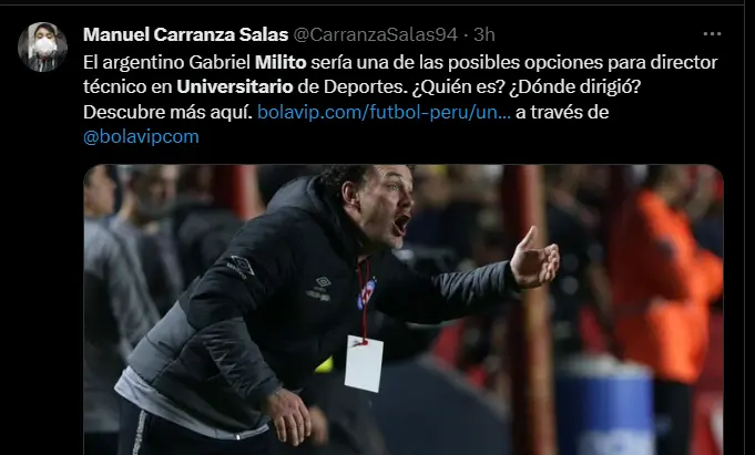 “El argentino Gabriel Milito sería una de las posibles opciones para director técnico en Universitario de Deportes”; fue la información del comunicador Manuel Carranza de ´Infobae Perú´. A raíz de esta información es que se vienen tejiendo muchos más rumores y versiones de que incluso Manuel Barreto ya estaría camino a Argentina para reunirse personalmente con varios entrenadores y uno de los seleccionados para tentar una posibilidad de llegar a Ate es el argentino de 43 años.