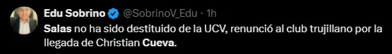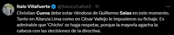 "Guilllermo Salas no continuará en el Club César Vallejo de Trujillo. El entrenador nacional decidió renunciar y ayer por la noche se lo informó a los directivos. Esta mañana se despidió del plantel en la villa poeta. Aún falta concretar el tema económico, pero está decidida su salida", fue lo que dio a conocer el periodista deportivo Gustavo Peralta en sus redes sociales, dejando en claro que fue el 'Chicho' el que decidió salir del club ante la llegada de Christian Cueva.