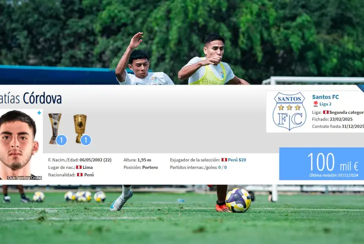 De acuerdo con el portal especializado Transfermarkt, Matías Córdova está cotizado en 100 mil euros en el mercado de pases. Esta cifra ha disminuido con respecto a años anteriores, ya que, en su mejor momento con Sporting Cristal en 2022, su valor llegó a los 125 mil euros. La caída en su cotización refleja la falta de minutos en el primer equipo del club cervecero y el poco protagonismo que ha tenido en el último tiempo. Sin embargo, una buena temporada en Santos FC podría permitirle recuperar su nivel y revalorizarse en el mercado.