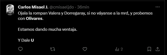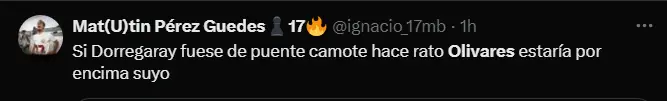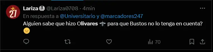 “Ojala la rompan Valera y Dorregaray, si no váyanse a la mrd, y probemos con Olivares. Estamos dando mucha ventaja. Y Dale U”, “Si Dorregaray fuese de puente camote hace rato Olivares estaría por encima suyo”, “La gente pide a Olivares, Bustos... Ojalá que pronto le den su oportunidad” y “Alguien sabe que hizo Olivares para que Bustos no lo tenga en cuenta?”; son algunos de los comentarios más llamativos que se pueden apreciar en twitter en señal de que los hinchas cremas no entienden por qué hasta ahora no usan al ´Zancudito´.