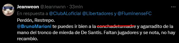 El hincha no está nada contento con Bruno Marioni, Director Deportivo del club y que ha dejado mucho que desear con sus fichajes, siendo el más importante y que ha sido vital para que Alianza Lima se vaya de la Copa Libertadores, ese es Jeriel De Santis, quien no estuvo bien en ninguno de los partidos. Apuesta en Betsson a los partidos de las mejores ligas del mundo y recibe un bono de bienvenida de 50 soles