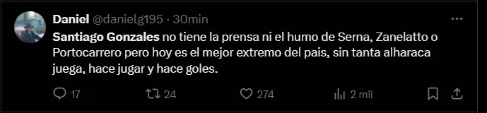 Al margen de esta situación es que el equipo bajopontino ya encontró a otro verdadero crack que la viene rompiendo en este arranque de la temporada 2024 y que gracias a sus rendimientos ya se ganó el corazón de la hinchada que en redes sociales le revienta hartos cohetes como si se tratara de otra nueva estrella a la que adoptarán al máximo. Estamos hablando de Santiago Gonzáles, quien hoy brilló con gran calidad en el Estadio Nacional. Apuesta en Betsson a los partidos de las mejores ligas del mundo y recibe un bono de bienvenida de 50 soles