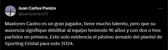 “Maxloren Castro es un gran jugador, tiene mucho talento, pero que su ausencia signifique debilitar al equipo teniendo 16 años y con dos o tres partidos en primera. Esto solo evidencia el pésimo armado del plantel de Sporting Cristal para este 2024”; fue el contundente comentario del comunicador deportivo Juan Carlos Panizo soltando una cruda realidad que muchos allegados a los celestes sostienen a estas alturas del año.