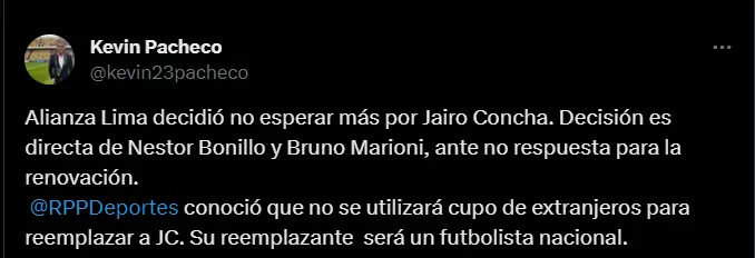 “Alianza Lima decidió no esperar más por Jairo Concha. Decisión es directa de Néstor Bonillo y Bruno Marioni, ante no respuesta para la renovación. RPPDeportes conoció que no se utilizará cupo de extranjeros para reemplazar a JC. Su reemplazante será un futbolista nacional”; fue la tremenda revelación del periodista nacional en mención a través de su cuenta de twitter, la cual viene siendo incendiada de comentarios a favor y en contra de lo que representa el hecho de haber cambiado una gran parte del plantel de Alianza a diferencia de este 2023.