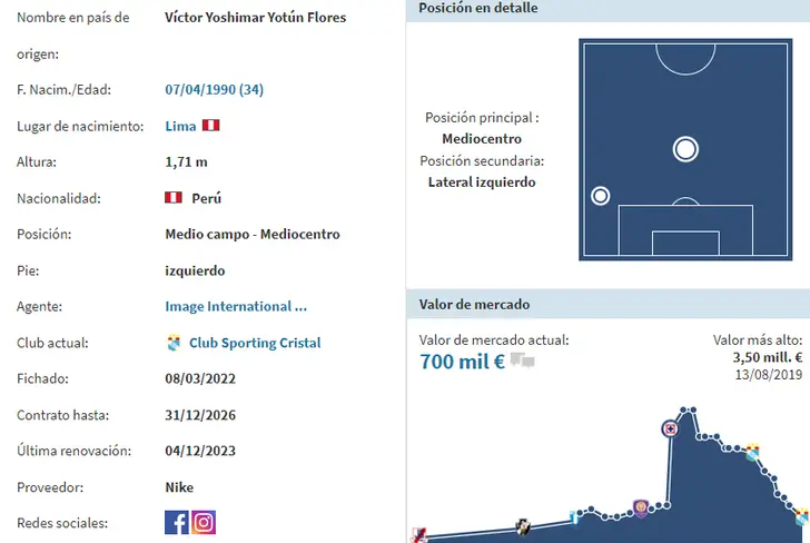 De acuerdo al portal especializado ´Transfermarkt´ y la nueva actualización que ha realizado en las últimas horas hemos podido apreciar que el máximo referente de Sporting Cristal ha decaído notablemente en un valor monetario en el mercado internacional, así que no solo el hecho de perderse partidos importantes en esta temporada lo ha afectado, sino que también el hecho de ya no costar un precio elevado lo ha golpeado. Apuesta en Betsson a los partidos de las mejores ligas del mundo y recibe un bono de bienvenida de 50 soles