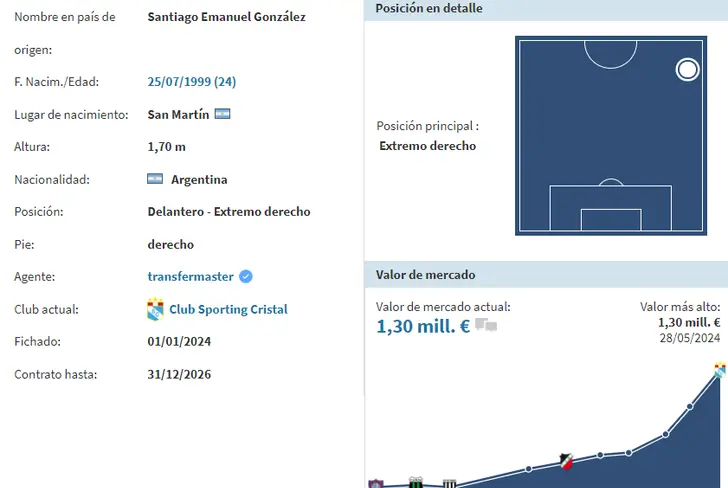 Durante los últimos días se ha venido conociendo que Santiago González andaba en los planes del fútbol argentino pegar la vuelta ya que sus rendimientos en la Liga 1 habrían despertado un gran interés por parte de algunos equipos. A la vez se pudo confirmar que no será vendido ni tampoco prestado al ser parte vital del proyecto deportivo de Sporting Cristal, aunque no es la única noticia buena que han recibido los hinchas, sino que también el atacante ya es el tercer jugador con mejor cotización internacional del plantel.