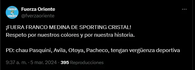 “¡FUERA FRANCO MEDINA DE SPORTING CRISTAL! Respeto por nuestros colores y por nuestra historia. PD: chau Pasquini, Avila, Otoya, Pacheco, tengan vergüenza deportiva”; es la tremenda exclamación que realizó la página oficial de ´Fuerza Oriente´ a través de twitter en señal de no aguantar más a nombres que no están dando el 100% cuando tienen la oportunidades de ser titulares o alternar en la idea de Enderson Moreira en lo que va de la temporada 2024.