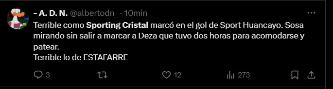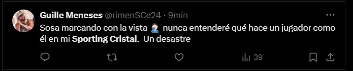 "Sosa marcando con la vista. Nunca entenderé qué hace un jugador como él en mi Sporting Cristal. Un desastre" y "Terrible como Sporting Cristal marcó en el gol de Sport Huancayo. Sosa mirando sin salir a marcar a Deza que tuvo dos horas para acomodarse y patear. Terrible lo de ESTAFARRE"; son algunos de los comentarios más llamativos y resonantes por parte de los aficionados de Sporting Cristal en relación al desempeño que está mostrando el carrilero con raíces uruguayas en el duelo ante Sport Huancayo.