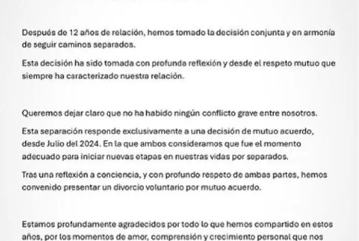 "Después de 12 años de relación, hemos tomado la decisión conjunta y en armonía de seguir caminos separados. Queremos dejar claro que no habido ningún conflicto grave entre nosotros. Una decisión de mutuo acuerdo desde Julio del 2024",