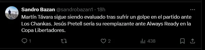 “Martín Távara sigue siendo evaluado tras sufrir un golpe en el partido ante Los Chankas. Jesús Pretell sería su reemplazante ante Always Ready en la Copa Libertadores”; fue la reveladora información del comunicador deportivo Sandro Bazán en señal de que el volante central del cuadro bajopontino tiene grandes chances de perderse el encuentro en horas de la noche cuando seguramente lo esperarán hasta último momento. Apuesta en Betsson a los partidos de las mejores ligas del mundo y recibe un bono de bienvenida de 50 soles