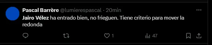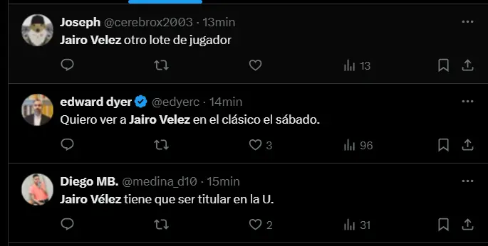 Desde su ingreso al terreno de juego, Jairo Vélez demostró que no le temía a la magnitud del partido y asumió la responsabilidad de buscar alternativas para Universitario. Mientras que otros jugadores se veían desanimados y desconectados del juego, el ecuatoriano pidió constantemente el balón, lo trasladó con dinamismo y buscó generar faltas a favor del equipo. Con su agilidad y capacidad para hacer jugadas, Vélez fue el único que, al menos, intentó cambiar la dinámica del encuentro, sabiendo que el tiempo estaba en su contra.