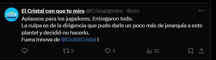 En redes sociales, la consigna ha sido clara: "Fuera Innova de Cristal". Un sector importante de la hinchada sostiene que el equipo merecía un plantel con más jerarquía para competir de igual a igual contra equipos como Palmeiras. "Aplausos para los jugadores. Entregaron todo. La culpa es de la dirigencia que pudo darle un poco más de jerarquía a este plantel y decidió no hacerlo. Fuera Innova de Cristal", escribió un hincha indignado tras la derrota.