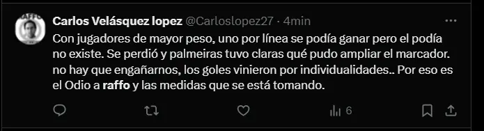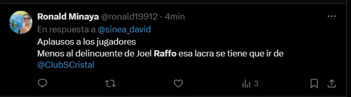 Si bien Cristal compitió bien ante Palmeiras, la diferencia de jerarquía terminó marcando la diferencia en el marcador. Y eso es algo que los hinchas no le perdonan a Raffo. "Aplausos a los jugadores, menos al delincuente de Joel Raffo. Esa lacra se tiene que ir de Cristal", se lee en otro comentario en redes sociales. La falta de fichajes de peso y la salida de jugadores importantes han sido dos de las principales críticas a su gestión. Los hinchas creen que con un refuerzo clave por línea, el equipo habría tenido más chances de conseguir un mejor resultado ante Palmeiras.